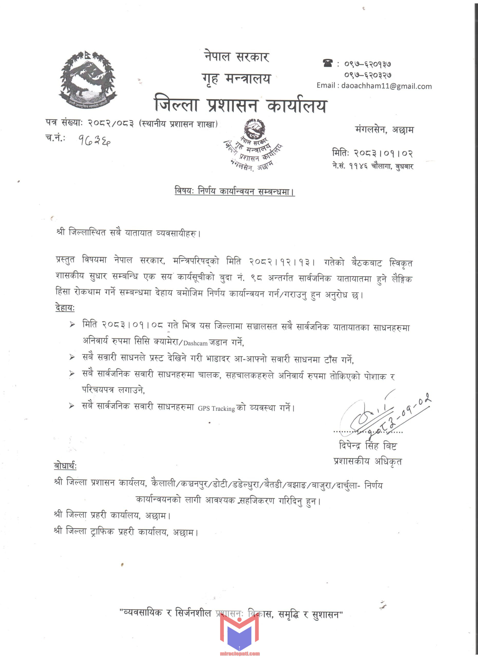 सार्वजनिक यातायातलाई सुरक्षित बनाउने र लैङ्गिक हिंसा रोकथाम गर्ने उद्देश्यले प्रशासनले यो कडा कदम चालेको हो । नेपाल सरकारको निर्णय अनुसार जिल्लाका सार्वजनिक यातायातमा यस्तो निर्णय कार्यान्वयन गर्न भनिएको छ । प्रशासकीय अधिकृत दिपेन्द्र सिंह विष्टद्वारा जारी सूचना अनुसार अछाममा सञ्चालित हरेक सार्वजनिक सवारीमा सुरक्षाका लागि सिसी क्यामेरा अनिवार्य गरिएको छ । यस्तै सवारी साधनको निगरानीका लागि जीपीएस ट्र्याकिङ प्रणाली जडान गर्नुपर्ने कार्यालयले जारी ‘निर्णय कार्यान्वयन सम्बन्धमा’ सूचनामा उल्लेख गरिएको छ ।